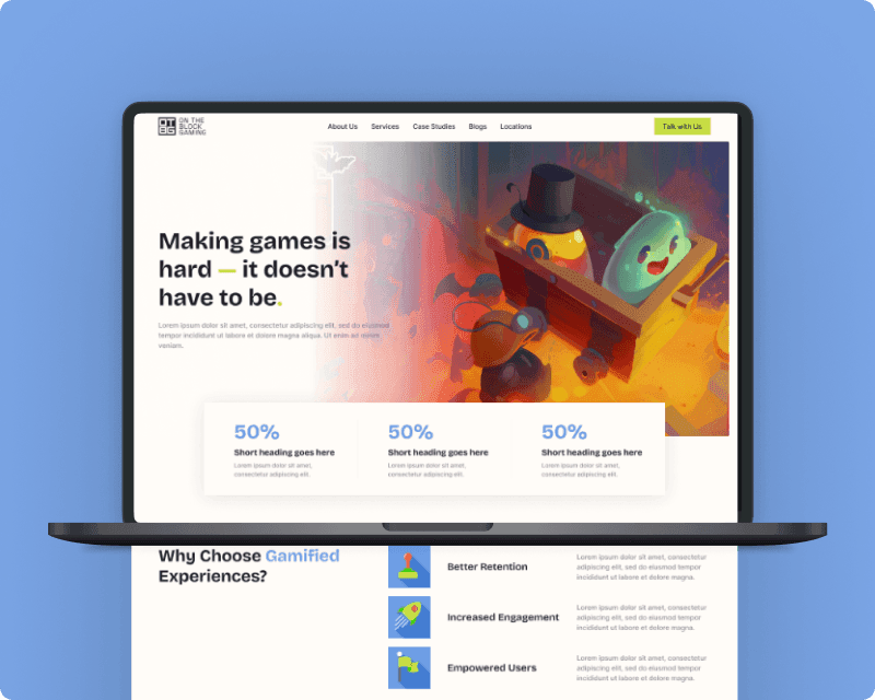 On The Block Gaming provides gamification services, converting complex or routine processes into engaging interactive experiences for clients. Their previous website failed to effectively communicate their brand strength or showcase their project portfolio effectively. Branding inconsistencies existed across multiple platforms, and they lacked unified design assets for social media and offline marketing.