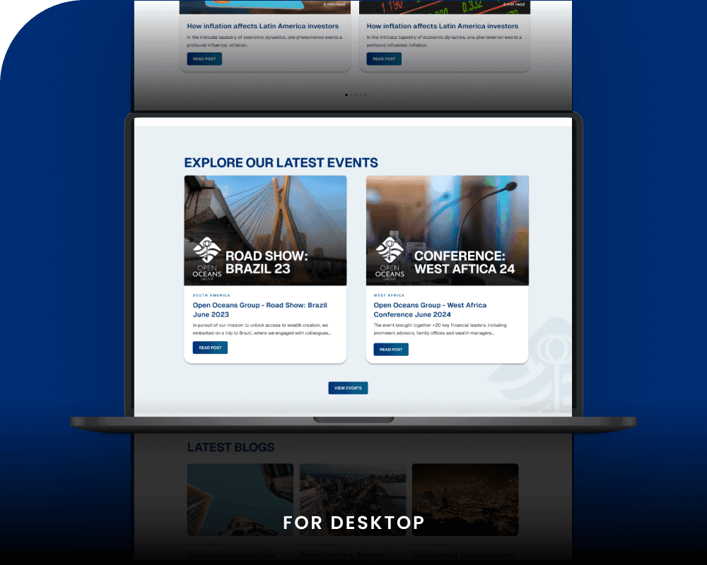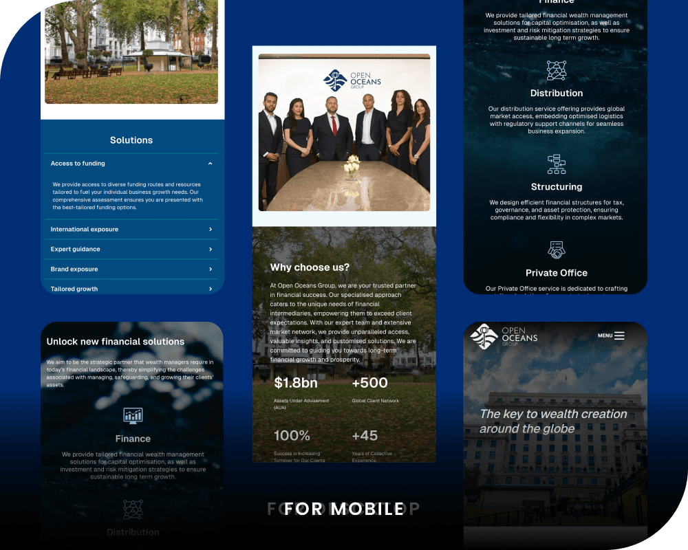 Custom interface components, including investment portfolio visualizations, service descriptions, and team credentials, distinguished Open Oceans Group from competitors while upholding restraint. A carefully selected color palette conveyed confidence, discretion, and expertise—key qualities for wealth management clients. The responsive design ensured a seamless premium experience across devices, accommodating clients’ transitions between desktop and mobile.