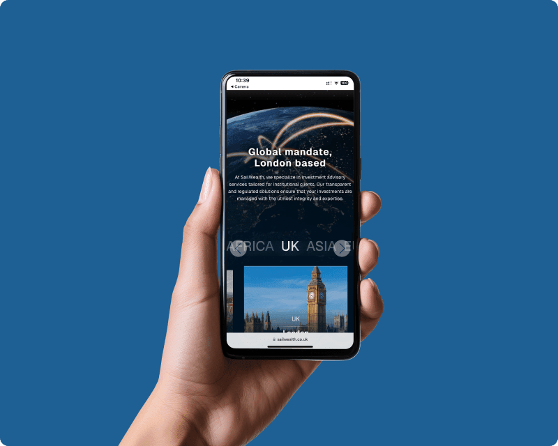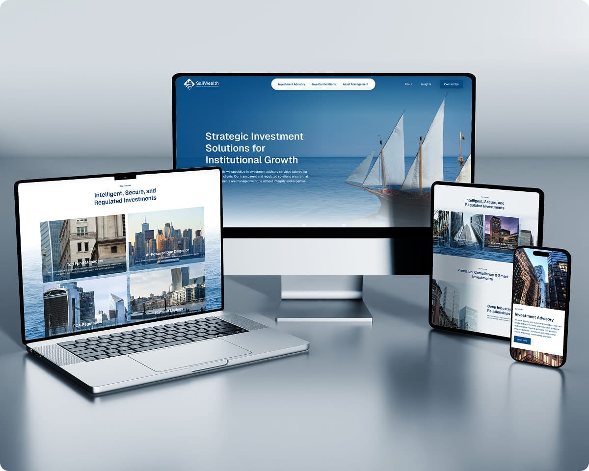 SailWealth is a London-based investment advisory and asset management firm serving institutional clients and international partners. As a newly established FCA-regulated firm entering the market, SailWealth needed a premium, professional digital presence that complied with strict financial regulations, demonstrated clear business structure, showcased thought leadership, and represented their global operations.
